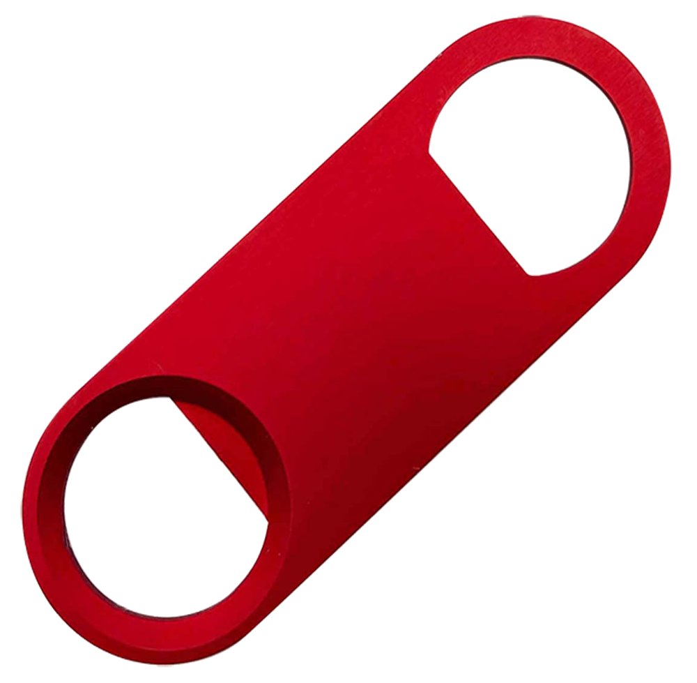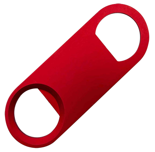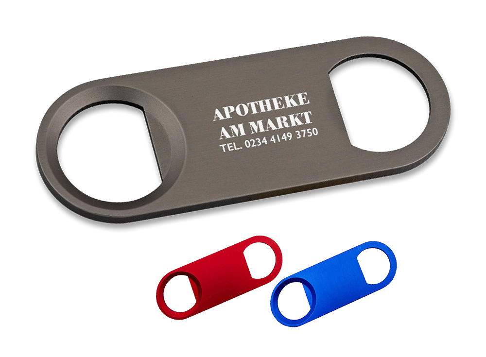 Flaschenöffner „DOUBLE“ in handlicher Form aus Aluminium hergestellt. Beidseitig zu benutzen mit großer Werbefläche. (Format: 90 x 33 x 3,5 mm)