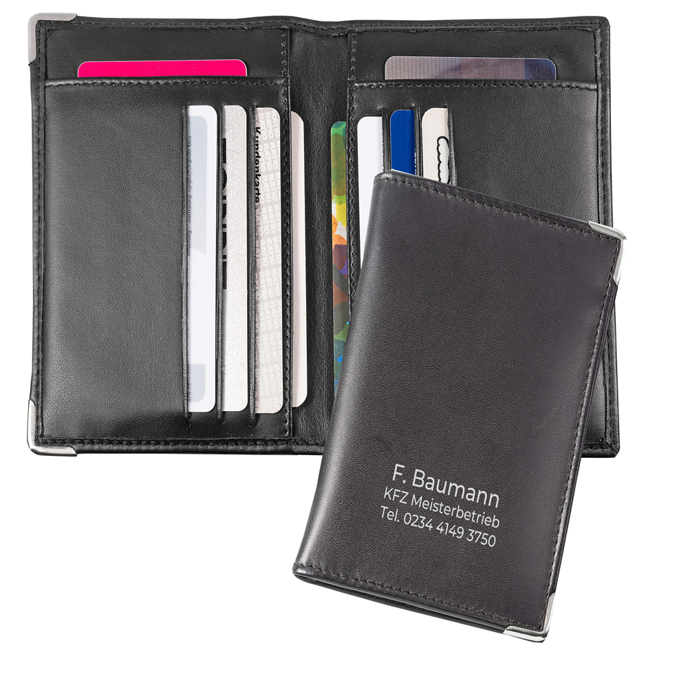 Ausweistasche "PROFI" ist eine hochwertige Kunstlederausführung mit 2 Silberecken und vielen Einsteckfächern. 6 Kreditkartenfächer, 4 weitere für dieverse Papiere. TOP-Qualität in sehr guter Verarbeitung. (Format: 90 x 125 mm)