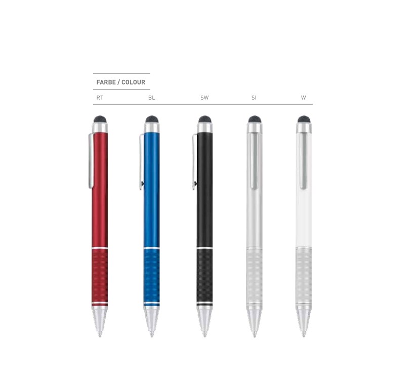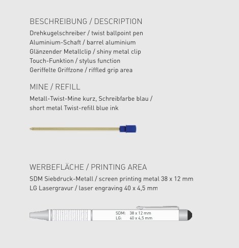 Drehkugelschreiber mit Touch-Funktion, Aluminium Schaft, Metallclip und geriffelte Griffzone,... mehr