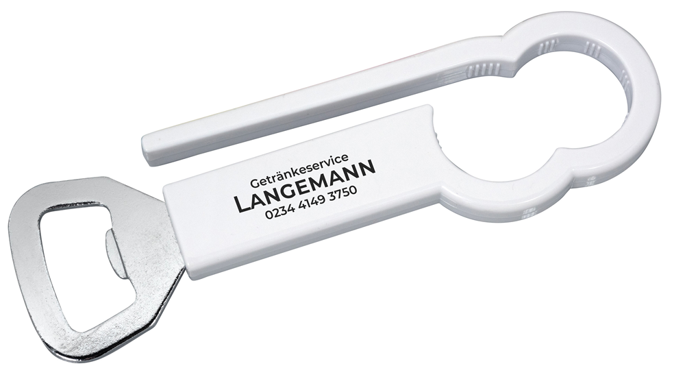Flaschenöffner "ERNI" mit Drehverschlussöffner für unterschiedliche Durchmesser.( Format: 150 x 40 mm)