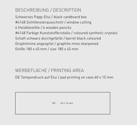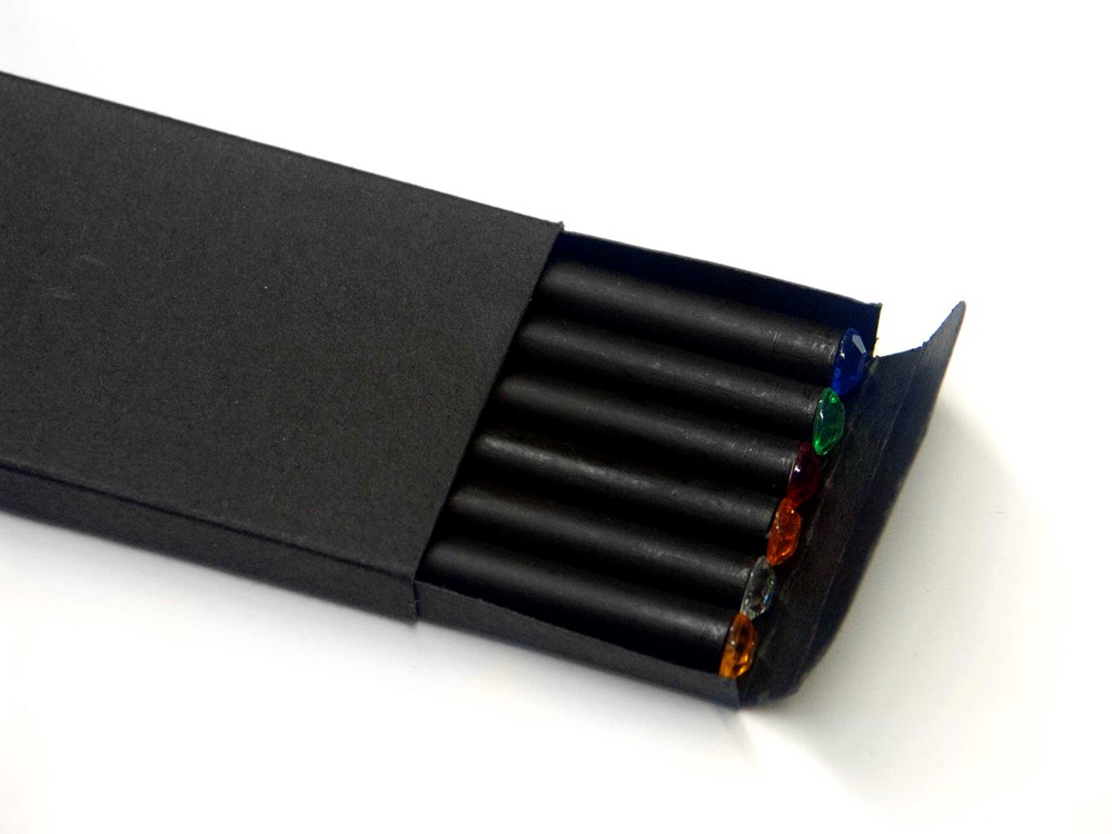 im 6er Geschenkset aus Karton präsentiert sich mit Klasse und Glanz, der LAROS Crystal Pencil und setzt stilvolle Akzente! Die edlen, schwarz durchgefärbten Holzbleistifte, die mit farbig funkelnden Kunststoff-Kristallen bestückt sind, machen das Set zu einem unübersehbaren Blickfang! Ein tolles und beliebtes Werbegeschenk, welches mit einem individuellen Werbedruck auf dem Etui noch persönlicher wird!