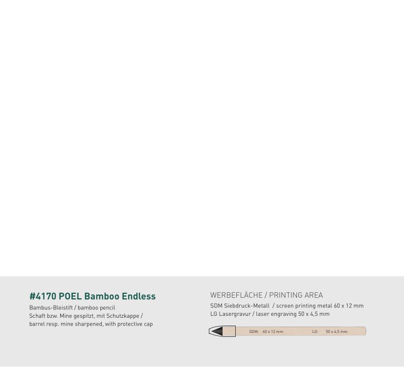 Ob fürs Büro, in der Freizeit, Schule oder Uni: Schreib- und Zeichenkomfort wie mit einem herkömmlichen Bleistift, jedoch besitzt dieser Stift eine ökologisch wertvolle Graphenspitze, die kaum abnutzt, immer gespitzt bleibt und radierbar ist. Neben der Langlebigkeit ist das gleichbleibende feine Schriftbild ein weiterer Pluspunkt – die Graphenspitze schreibt und schreibt und schreibt…. man könnte fast sagen „unendlich“. Geschützt wird die Spitze durch eine Steckkappe. Der handliche und angenehm anzufassende Schaft ist aus schnell nachwachsendem Bambus gefertigt und somit ist jeder Stift einzigartig und doppelt „Grün“. Ein ganz besonderes Werbegeschenk!