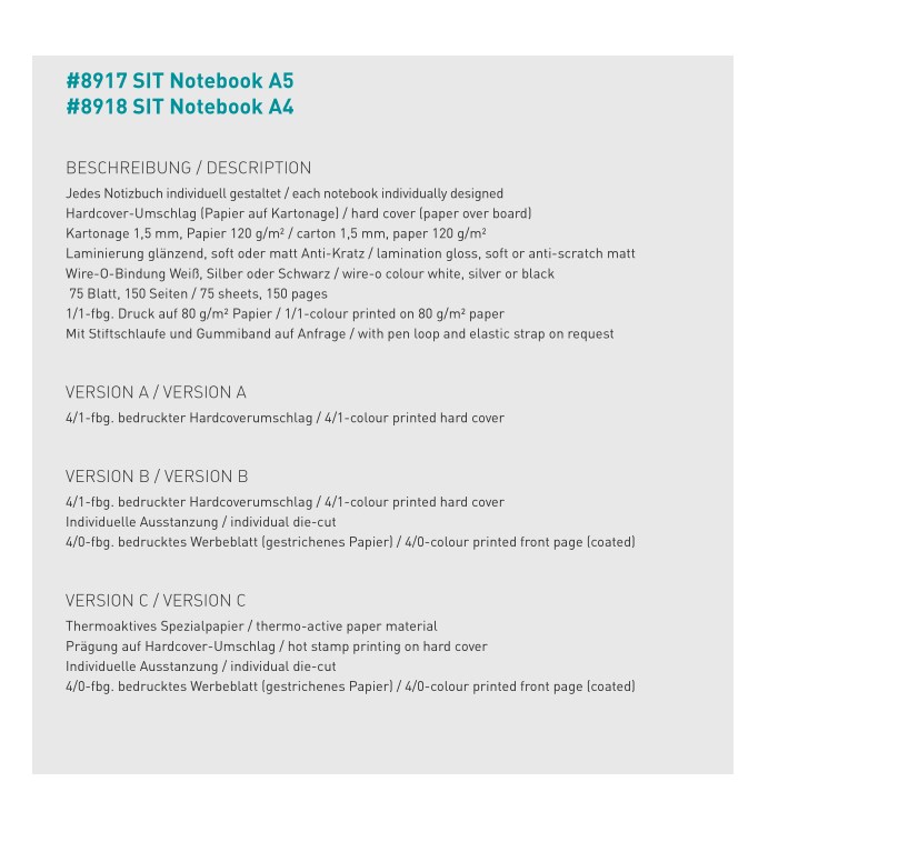 Das SIT Notebook im DIN A 4 Format, gibt es mit linierten, karierten oder blanko-Inhalten und natürlich kann zwischen verschiedenen Einbänden gewählt werden. Für die Ringbindung stehen Schwarz, Silber und Weiß zur Auswahl…..und da es noch viele andere individuelle Möglichkeiten und zusätzliche Ausstattung gibt, bieten wir diese gern auf Anfrage an.