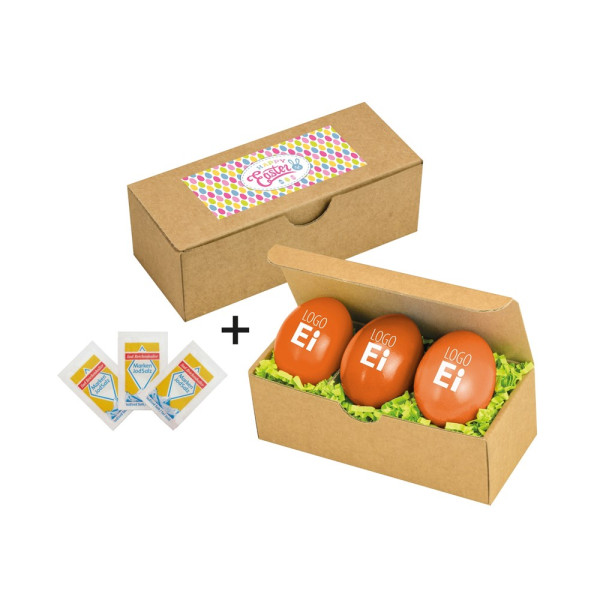 3 x LogoEi, Farbe Orange, inkl. Druck 1c, dazu 3 Mini-Salztütchen je 1 g in einer Snack-Box. • Wir verwenden nur ausgesuchte Eier der Güteklasse A. Die exakt kontrollierte Kochdauer und der erstklassige Geschmack sorgen für ein originelles, persönliches und wertvolles Geschenk mit einer Haltbarkeit von 4 Wochen. Mögliche Individualisierung: Etikett 4c, Druck 1c oder Druck 4c direkt auf die Snack-Box.