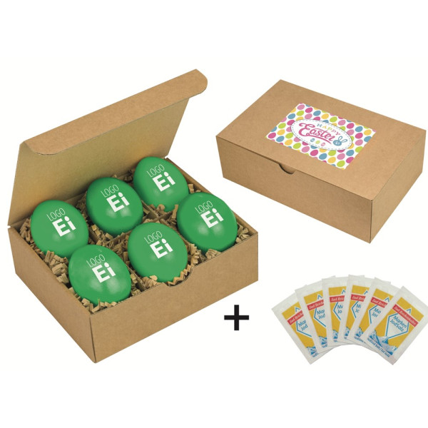 6 x LogoEi, Farbe Grün, inkl. Druck 1c, dazu 6 Mini-Salztütchen je 1 g in einer Snack-Box aus Karton. • Wir verwenden nur ausgesuchte Eier der Güteklasse A. Die exakt kontrollierte Kochdauer und der erstklassige Geschmack sorgen für ein originelles, persönliches und wertvolles Geschenk mit einer Haltbarkeit von 4 Wochen. Mögliche Individualisierung: Etikett 4c, Druck 1coder Druck 4c direkt auf die Snack-Box.