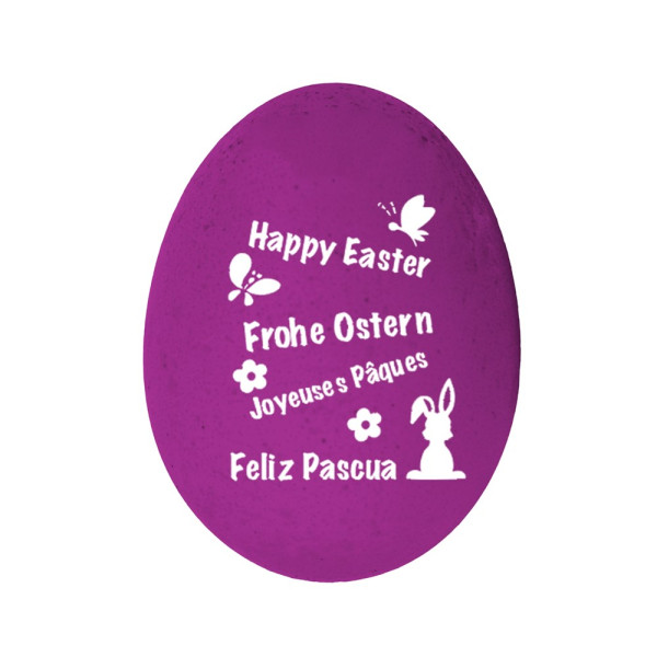 1 buntes Qualitäts-Ei Farbe Lila, bedruckt mit "Frohe Ostern" - mehrsprachig. • Wir verwenden nur ausgesuchte Eier der Güteklasse A. Die exakt kontrollierte Kochdauer und der erstklassige Geschmack sorgen für ein originelles, persönliches und wertvolles Geschenk mit einer Haltbarkeit von 4 Wochen.