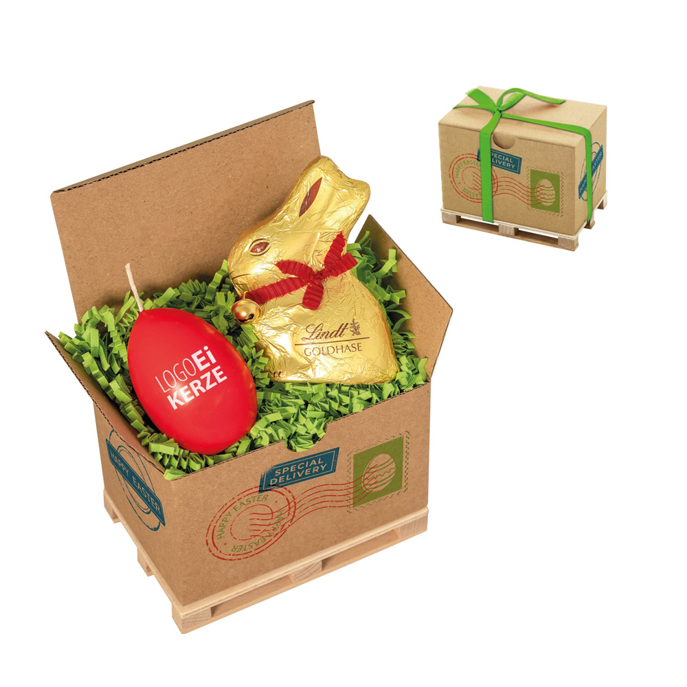 1 origineller Palettencontainer aus Karton mit Standard-Druck "Happy Easter - Special Delivery", verschnürt mit grünem Schleifenband auf einer Minipalette aus Echtholz, gefüllt mit 1 Lindt Goldhasen 50 g und 1 LogoEi Kerze inkl. Druck 1c, bunt sortiert (5 verschiedene Farben). • Die Eierkerze in 5 leuchtenden Farben, bunt sortiert, ist genau so groß wie ein echtes Ei (6,2 cm hoch) und 100% Made in Germany, sowie RAL zertifiziert. Es werden ausschließlich hochwertige Rohstoffe verwendet, die bei sachgemäßer Handhabung ein ausgesprochen ruß- und raucharmes, sowie tropffreies Abbrennen garantieren. Die praktische Cargo-Box kann mit einem Druck 4c, Druck 1c, Etikett 4c oder Anhänger 4c an der Schleife individualisiert werden. Im Preis enthalten ist bereits der individuelle 1c Druck auf der Kerze, pro Motiv werden einmalig Vorkosten berechnet.