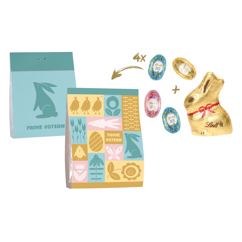 1 Smart Bag mit 4 Lindt Mini-Eiern je 5 g und 1 Lindt Mini-Hasen 10 g. • Die 4 Lindt Mini-Eier je 5 g und der 1 Lindt Mini-Hase 10 g sind verpackt in einem Folientütchen mit Smart-Bag Standard-Banderole „Frohe Ostern“. Mögliche Individualisierung: Smart Bag Banderole mit 4c-Digitaldruck. Die Smart Bag Banderole deckt die komplette Front, den Rücken und Boden des Beutels ab und bietet daher viel Fläche für ein individuelles und kreatives Design (Breite 8,8 cm und eine Länge von insgesamt 28 cm).