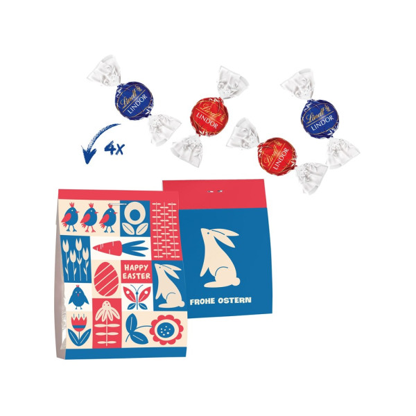 1 Smart Bag mit 2 Lindt Lindor Kugeln Vollmilch und 2 Lindt Lindor Kugeln Feinherb, je 12,5 g. • Die 4 Lindor Kugeln sind verpackt in einem Folientütchen mit Smart-Bag Standard-Banderole „Frohe Ostern“. Mögliche Individualisierung: Smart Bag Banderole mit 4c-Digitaldruck. Die Smart Bag Banderole deckt die komplette Front, den Rücken und Boden des Beutels ab und bietet daher viel Fläche für ein individuelles und kreatives Design (Breite 8,8 cm und eine Länge von insgesamt 28 cm).