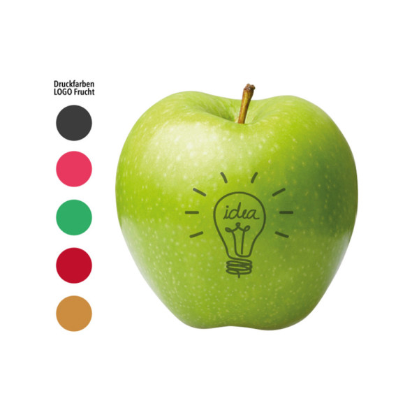 1 Qualitäts-Apfel grün, inkl. LogoFrucht Druck " Brainstorming" in Blackberry (VE 39 Stück in Apfel-Steige) • Der Apfel wird mit einem schonenden Druckverfahren und hochwertigen Lebensmittelfarbstoffen bedruckt, es stehen 5 Druckfarben zur Verfügung: Raspberry, Kiwi, Strawberry, Hazelnut und Blackberry. Im Gegensatz zur Lasergravur wird die Schale des Apfels nicht beschädigt, denn der LOGO-Frucht-Druck hat keinen Einfluss auf die Lagerfähigkeit oder Frische des Apfels. Optional kann zusätzlich die Rückseite des Apfels mit Logo oder Werbebotschaft bedruckt werden.
