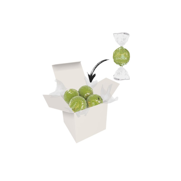 1 ColorBox (Farbe nach Wahl) gefüllt mit 4 Lindt Lindor Kugeln (Sorte nach Wahl) je 12,5 g. • Quadratisch, flexibel und nachhaltig: die ColorBox ist ein Naturprodukt "MADE IN GERMANY" welches aus 100% Recyclingpapier hergestellt wird und in 13 leuchtenden Farben erhältlich ist. Die ColorBox kann auf Wunsch mit einem 4c Aufkleber oder 1c Druck individualisiert werden, weitere mögliche Werbeanbringungen sind eine Banderole 4c um die Box herum und ab 3000 Stück ein All-Over Druck 4c.