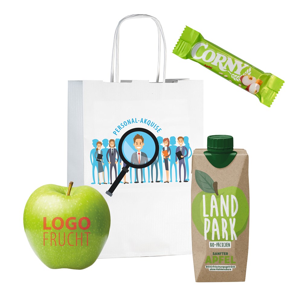 1 LOGOFrucht Apfel grün inkl. LOGOFrucht-Druck Raspberry, 1 Papiertragetasche mit gedrehten Papierkordeln inkl. Standard-Druck "Recruiting", 1 Corny Riegel Apfel 25 g und 1 Landpark Bio-Quelle Sanfter Apfel 500 ml (Erfrischungsgetränk, stilles Bio-Mineralwasser mit Apfel-Geschmack) • Der Apfel wird mit einem schonenden Druckverfahren und hochwertigen Lebensmittelfarbstoffen bedruckt, es stehen 6 Druckfarben zur Verfügung: Raspberry, Kiwi, Strawberry, Hazelnut, Blackberry und Goldberry. Im Gegensatz zur Lasergravur wird die Schale des Apfels nicht beschädigt, denn der LOGO-Frucht-Druck hat keinen Einfluss auf die Lagerfähigkeit oder Frische des Apfels. Die Papier-Tüte kann auf der Vorderseite optional mit einem 4c Druck individualisiert werden.
