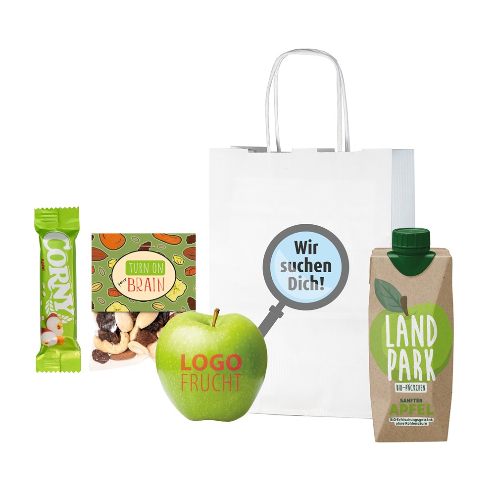 1 LOGOFrucht Apfel grün inkl. LOGOFrucht-Druck Raspberry, 1 Papiertragetasche mit gedrehten Papierkordeln inkl. Standard-Druck "Apfel", 1 Corny Riegel Apfel 25 g, 1 Beutel Studentenfutter 40 g und 1 Landpark Bio-Quelle Sanfter Apfel 500 ml (Erfrischungsgetränk, stilles Bio-Mineralwasser mit Apfel-Geschmack) • Der Apfel wird mit einem schonenden Druckverfahren und hochwertigen Lebensmittelfarbstoffen bedruckt, es stehen 6 Druckfarben zur Verfügung: Raspberry, Kiwi, Strawberry, Hazelnut, Blackberry und Goldberry. Im Gegensatz zur Lasergravur wird die Schale des Apfels nicht beschädigt und er bleibt länger frisch und saftig. Die Papier-Tüte kann auf der Vorderseite optional mit einem 4c Druck individualisiert werden.