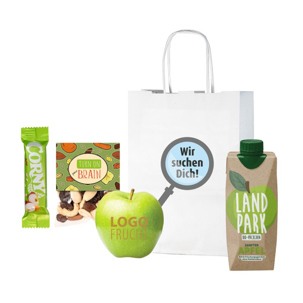 1 LOGOFrucht Apfel grün inkl. LOGOFrucht-Druck Hazelnut, 1 Papiertragetasche mit gedrehten Papierkordeln inkl. Standard-Druck "Apfel", 1 Corny Riegel Apfel 25 g, 1 Beutel Studentenfutter 40 g und 1 Landpark Bio-Quelle Sanfter Apfel 500 ml (Erfrischungsgetränk, stilles Bio-Mineralwasser mit Apfel-Geschmack) • Der Apfel wird mit einem schonenden Druckverfahren und hochwertigen Lebensmittelfarbstoffen bedruckt, es stehen 6 Druckfarben zur Verfügung: Raspberry, Kiwi, Strawberry, Hazelnut, Blackberry und Goldberry. Im Gegensatz zur Lasergravur wird die Schale des Apfels nicht beschädigt und er bleibt länger frisch und saftig. Die Papier-Tüte kann auf der Vorderseite optional mit einem 4c Druck individualisiert werden.