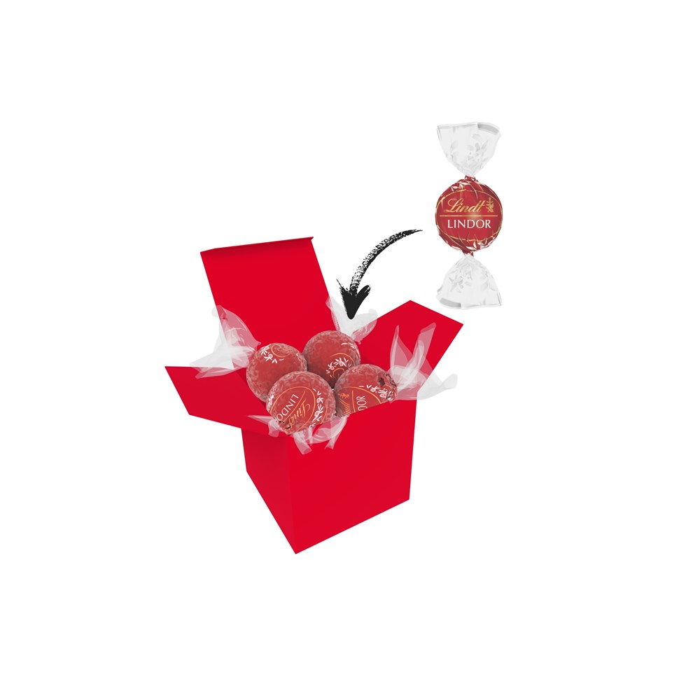 1 ColorBox (Farbe nach Wahl) gefüllt mit 4 Lindt Lindor Kugeln (Sorte nach Wahl) je 12,5 g. • Quadratisch, flexibel und nachhaltig: die ColorBox ist ein Naturprodukt "MADE IN GERMANY" welches aus 100% Recyclingpapier hergestellt wird und in 13 leuchtenden Farben erhältlich ist. Die ColorBox kann auf Wunsch mit einem 4c Aufkleber oder 1c Druck individualisiert werden, weitere mögliche Werbeanbringungen sind eine Banderole 4c um die Box herum und ab 3000 Stück ein All-Over Druck 4c.