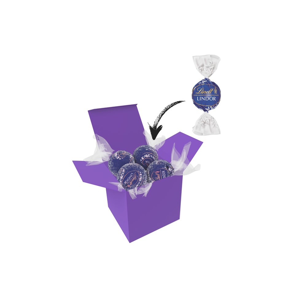 1 ColorBox (Farbe nach Wahl) gefüllt mit 4 Lindt Lindor Kugeln (Sorte nach Wahl) je 12,5 g. • Quadratisch, flexibel und nachhaltig: die ColorBox ist ein Naturprodukt "MADE IN GERMANY" welches aus 100% Recyclingpapier hergestellt wird und in 13 leuchtenden Farben erhältlich ist. Die ColorBox kann auf Wunsch mit einem 4c Aufkleber oder 1c Druck individualisiert werden, weitere mögliche Werbeanbringungen sind eine Banderole 4c um die Box herum und ab 3000 Stück ein All-Over Druck 4c.