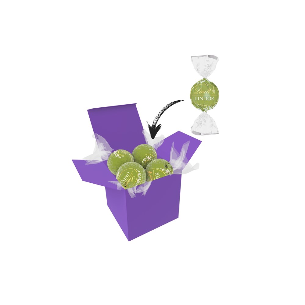 1 ColorBox (Farbe nach Wahl) gefüllt mit 4 Lindt Lindor Kugeln (Sorte nach Wahl) je 12,5 g. • Quadratisch, flexibel und nachhaltig: die ColorBox ist ein Naturprodukt "MADE IN GERMANY" welches aus 100% Recyclingpapier hergestellt wird und in 13 leuchtenden Farben erhältlich ist. Die ColorBox kann auf Wunsch mit einem 4c Aufkleber oder 1c Druck individualisiert werden, weitere mögliche Werbeanbringungen sind eine Banderole 4c um die Box herum und ab 3000 Stück ein All-Over Druck 4c.