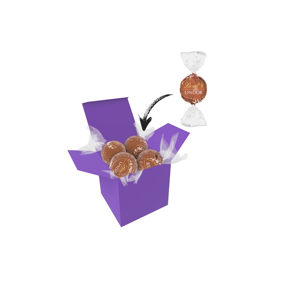 1 ColorBox (Farbe nach Wahl) gefüllt mit 4 Lindt Lindor Kugeln (Sorte nach Wahl) je 12,5 g. • Quadratisch, flexibel und nachhaltig: die ColorBox ist ein Naturprodukt "MADE IN GERMANY" welches aus 100% Recyclingpapier hergestellt wird und in 13 leuchtenden Farben erhältlich ist. Die ColorBox kann auf Wunsch mit einem 4c Aufkleber oder 1c Druck individualisiert werden, weitere mögliche Werbeanbringungen sind eine Banderole 4c um die Box herum und ab 3000 Stück ein All-Over Druck 4c.