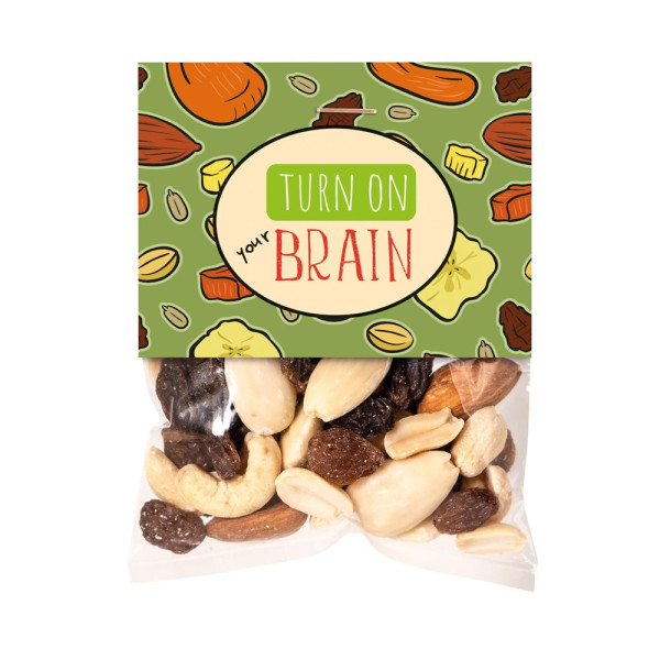 1 Beutel Studentenfutter 40 g. • Leckeres Studentenfutter, verpackt in einem Folientütchen mit Standard-Reiter „Turn on your Brain“. Mögliche Individualisierung: Reiter mit 4c-Digitaldruck, hierbei können Vorder- und Rückseite bedruckt werden.