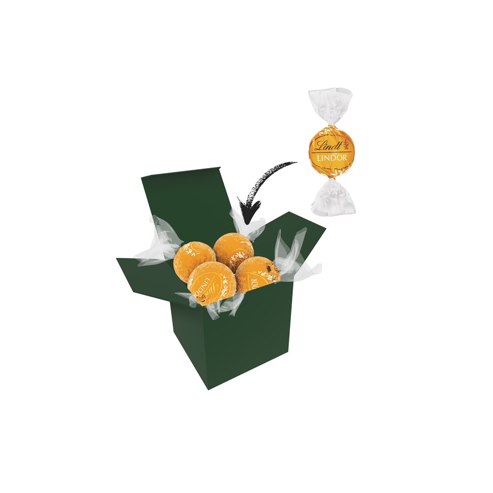 1 ColorBox (Farbe nach Wahl) gefüllt mit 4 Lindt Lindor Kugeln (Sorte nach Wahl) je 12,5 g. • Quadratisch, flexibel und nachhaltig: die ColorBox ist ein Naturprodukt "MADE IN GERMANY" welches aus 100% Recyclingpapier hergestellt wird und in 13 leuchtenden Farben erhältlich ist. Die ColorBox kann auf Wunsch mit einem 4c Aufkleber oder 1c Druck individualisiert werden, weitere mögliche Werbeanbringungen sind eine Banderole 4c um die Box herum und ab 3000 Stück ein All-Over Druck 4c.