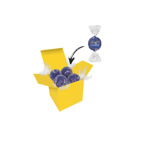 1 ColorBox (Farbe nach Wahl) gefüllt mit 4 Lindt Lindor Kugeln (Sorte nach Wahl) je 12,5 g. • Quadratisch, flexibel und nachhaltig: die ColorBox ist ein Naturprodukt "MADE IN GERMANY" welches aus 100% Recyclingpapier hergestellt wird und in 13 leuchtenden Farben erhältlich ist. Die ColorBox kann auf Wunsch mit einem 4c Aufkleber oder 1c Druck individualisiert werden, weitere mögliche Werbeanbringungen sind eine Banderole 4c um die Box herum und ab 3000 Stück ein All-Over Druck 4c.