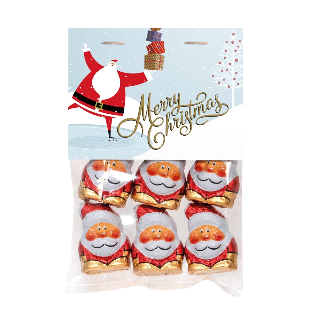 1 Beutel Mini-Weihnachtsmänner aus Vollmilchschokolade 30 g. • Mini-Weihnachtsmänner aus Vollmilchschokolade verpackt in einem Folientütchen mit Standard-Reiter „Merry Christmas“. Mögliche Individualisierung: Reiter mit 4c-Digitaldruck, hierbei können Vorder- und Rückseite bedruckt werden.