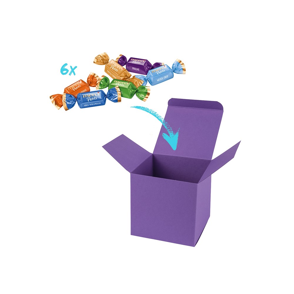 1 ColorBox Lila, gefüllt mit 6 Merci-Chocolate Collection je 6 g. Ein bunter Mix von Merci Schokoladen-Spezialitäten in den Geschmacksrichtungen Kaffee Sahne, Edel-Vollmilch, Praliné, Mandel, Dunkle Vollmilch, Weisse Crisp und Nougat (Sortierung kann von der Abbildung abweichen). • Quadratisch, flexibel und nachhaltig: die ColorBox ist ein Naturprodukt "MADE IN GERMANY" welches aus 100% Recyclingpapier hergestellt wird und in 13 leuchtenden Farben erhältlich ist. Die ColorBox kann auf Wunsch mit einem 4c Aufkleber oder 1c Druck individualisiert werden, weitere mögliche Werbeanbringungen sind eine Banderole 4c um die Box herum und ab 3000 Stück ein All-Over Druck 4c.