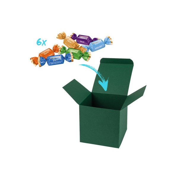 1 ColorBox Dunkelgrün, gefüllt mit 6 Merci-Chocolate Collection je 6 g. Ein bunter Mix von Merci Schokoladen-Spezialitäten in den Geschmacksrichtungen Kaffee Sahne, Edel-Vollmilch, Praliné, Mandel, Dunkle Vollmilch, Weisse Crisp und Nougat (Sortierung kann von der Abbildung abweichen). • Quadratisch, flexibel und nachhaltig: die ColorBox ist ein Naturprodukt "MADE IN GERMANY" welches aus 100% Recyclingpapier hergestellt wird und in 13 leuchtenden Farben erhältlich ist. Die ColorBox kann auf Wunsch mit einem 4c Aufkleber oder 1c Druck individualisiert werden, weitere mögliche Werbeanbringungen sind eine Banderole 4c um die Box herum und ab 3000 Stück ein All-Over Druck 4c.