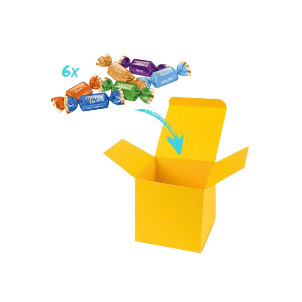 1 ColorBox Gelb, gefüllt mit 6 Merci-Chocolate Collection je 6 g. Ein bunter Mix von Merci Schokoladen-Spezialitäten in den Geschmacksrichtungen Kaffee Sahne, Edel-Vollmilch, Praliné, Mandel, Dunkle Vollmilch, Weisse Crisp und Nougat (Sortierung kann von der Abbildung abweichen). • Quadratisch, flexibel und nachhaltig: die ColorBox ist ein Naturprodukt "MADE IN GERMANY" welches aus 100% Recyclingpapier hergestellt wird und in 13 leuchtenden Farben erhältlich ist. Die ColorBox kann auf Wunsch mit einem 4c Aufkleber oder 1c Druck individualisiert werden, weitere mögliche Werbeanbringungen sind eine Banderole 4c um die Box herum und ab 3000 Stück ein All-Over Druck 4c.