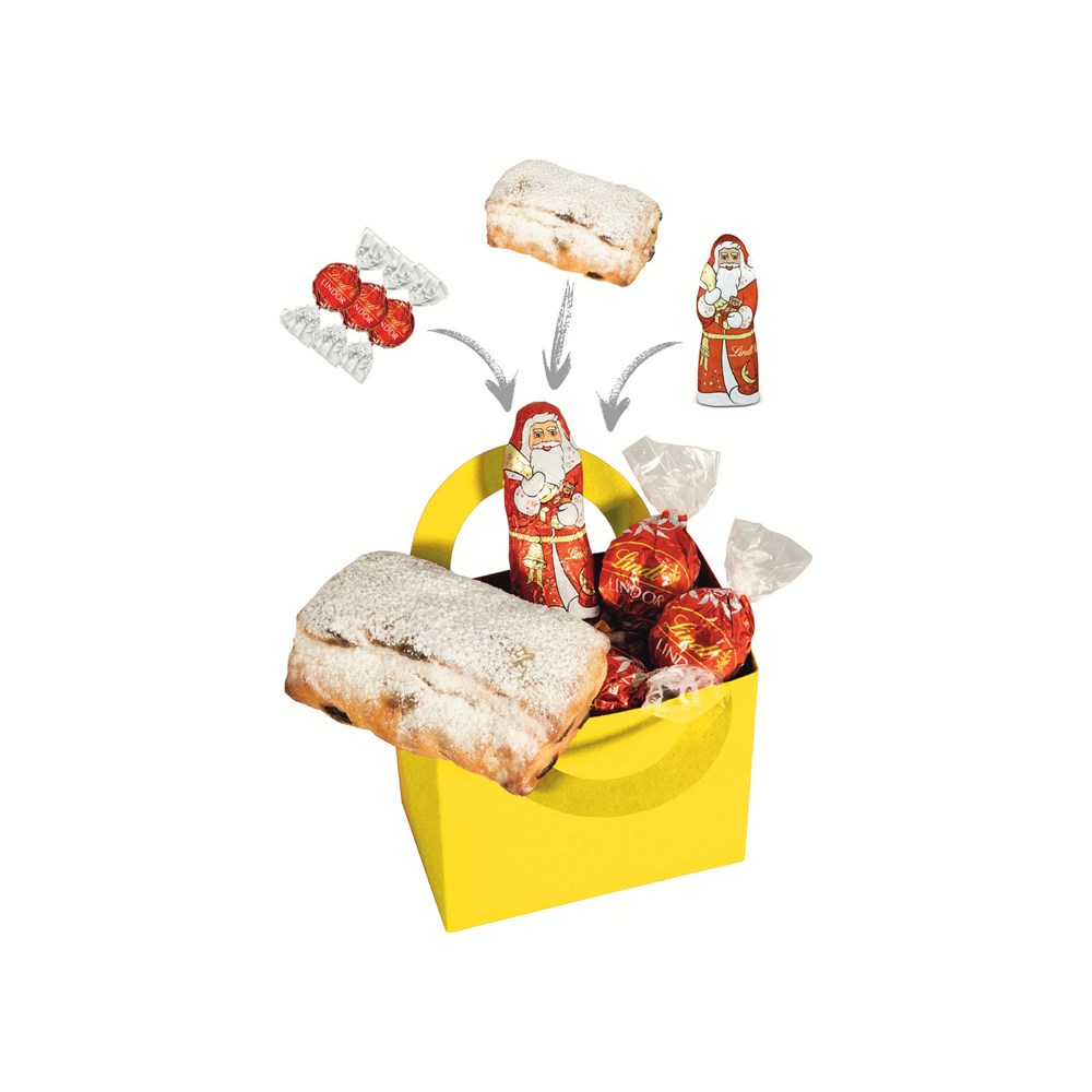 1 schicke Weihnachtstüte Gelb gefüllt mit: 1 Gourmet-Christstollen 80 g, 3 zartschmelzende Lindt Lindor Kugeln, je 12,5 g und 1 Lindt Weihnachtsmann 10 g. • Bunt und nachhaltig: die ColorBag ist ein Naturprodukt "MADE IN GERMANY" und wird aus 100% Recyclingpapier hergestellt. 4 leuchtende Farben sind erhältlich: blau, gelb, grün und rot. Die ColorBag kann auf Wunsch mit einem 1c Druck oder einem 4c Aufkleber individualisiert werden.