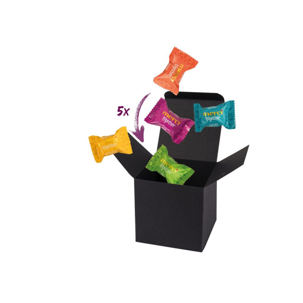 1 ColorBox Schwarz gefüllt mit 5 merci together je 9,2 g. • merci together sind gefüllte Pralinen in fünf köstlichen Sorten: Nougat Crunch, Crème Brûlée Nuss, Caramel Brownie, Cappuccino Nuss und Mandel Crème (die Sortierung kann von der Abbildung abweichen). Quadratisch, flexibel und nachhaltig: die ColorBox ist ein Naturprodukt "MADE IN GERMANY" welches aus 100% Recyclingpapier hergestellt wird. Die ColorBox kann auf Wunsch mit einem 4c Aufkleber oder 1c Druck individualisiert werden, weitere mögliche Werbeanbringungen sind eine Banderole 4c um die Box herum und ab 3000 Stück ein All-Over Druck 4c.