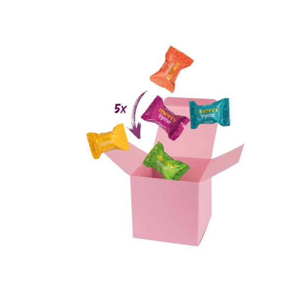 1 ColorBox Rosa gefüllt mit 5 merci together je 9,2 g. • merci together sind gefüllte Pralinen in fünf köstlichen Sorten: Nougat Crunch, Crème Brûlée Nuss, Caramel Brownie, Cappuccino Nuss und Mandel Crème (die Sortierung kann von der Abbildung abweichen). Quadratisch, flexibel und nachhaltig: die ColorBox ist ein Naturprodukt "MADE IN GERMANY" welches aus 100% Recyclingpapier hergestellt wird. Die ColorBox kann auf Wunsch mit einem 4c Aufkleber oder 1c Druck individualisiert werden, weitere mögliche Werbeanbringungen sind eine Banderole 4c um die Box herum und ab 3000 Stück ein All-Over Druck 4c.