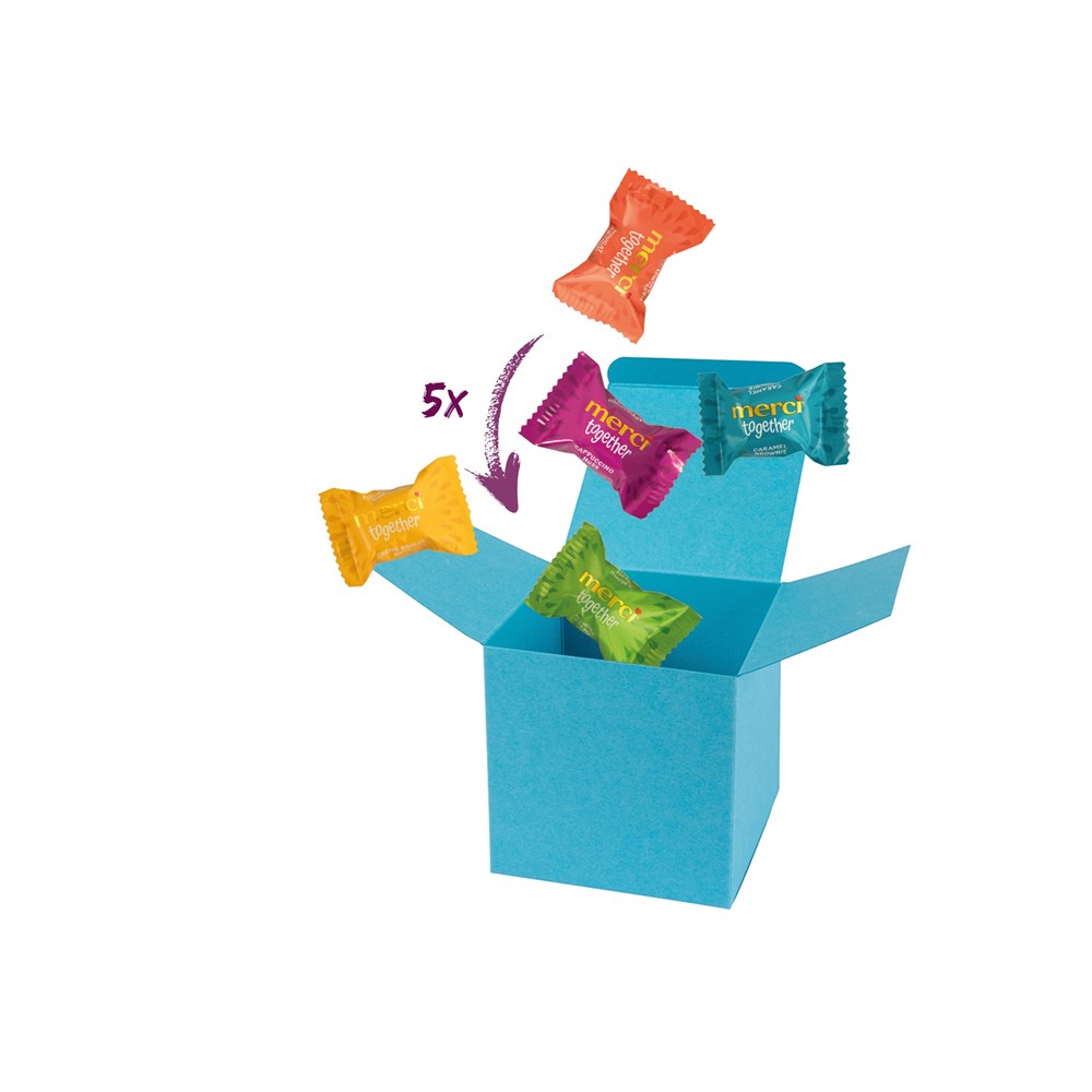 1 ColorBox Hellblau gefüllt mit 5 merci together je 9,2 g. • merci together sind gefüllte Pralinen in fünf köstlichen Sorten: Nougat Crunch, Crème Brûlée Nuss, Caramel Brownie, Cappuccino Nuss und Mandel Crème (die Sortierung kann von der Abbildung abweichen). Quadratisch, flexibel und nachhaltig: die ColorBox ist ein Naturprodukt "MADE IN GERMANY" welches aus 100% Recyclingpapier hergestellt wird. Die ColorBox kann auf Wunsch mit einem 4c Aufkleber oder 1c Druck individualisiert werden, weitere mögliche Werbeanbringungen sind eine Banderole 4c um die Box herum und ab 3000 Stück ein All-Over Druck 4c.