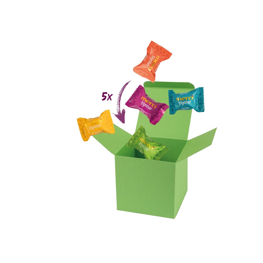 1 ColorBox Hellgrün gefüllt mit 5 merci together je 9,2 g. • merci together sind gefüllte Pralinen in fünf köstlichen Sorten: Nougat Crunch, Crème Brûlée Nuss, Caramel Brownie, Cappuccino Nuss und Mandel Crème (die Sortierung kann von der Abbildung abweichen). Quadratisch, flexibel und nachhaltig: die ColorBox ist ein Naturprodukt "MADE IN GERMANY" welches aus 100% Recyclingpapier hergestellt wird. Die ColorBox kann auf Wunsch mit einem 4c Aufkleber oder 1c Druck individualisiert werden, weitere mögliche Werbeanbringungen sind eine Banderole 4c um die Box herum und ab 3000 Stück ein All-Over Druck 4c.