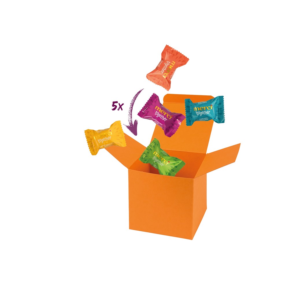 1 ColorBox Orange gefüllt mit 5 merci together je 9,2 g. • merci together sind gefüllte Pralinen in fünf köstlichen Sorten: Nougat Crunch, Crème Brûlée Nuss, Caramel Brownie, Cappuccino Nuss und Mandel Crème (die Sortierung kann von der Abbildung abweichen). Quadratisch, flexibel und nachhaltig: die ColorBox ist ein Naturprodukt "MADE IN GERMANY" welches aus 100% Recyclingpapier hergestellt wird. Die ColorBox kann auf Wunsch mit einem 4c Aufkleber oder 1c Druck individualisiert werden, weitere mögliche Werbeanbringungen sind eine Banderole 4c um die Box herum und ab 3000 Stück ein All-Over Druck 4c.