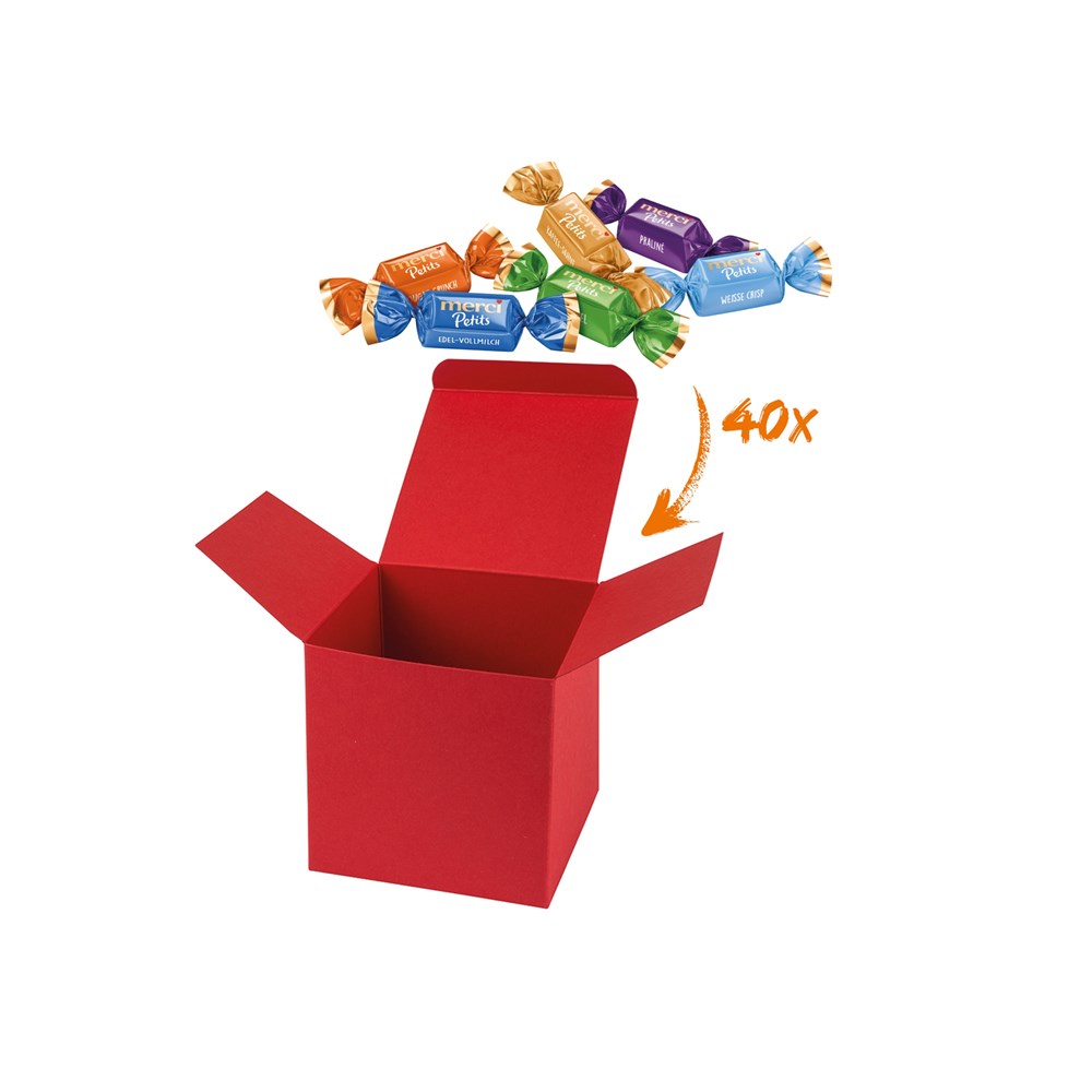 1 ColorBox Rot, gefüllt mit 40 Merci-Chocolate Collection je 6 g. Ein bunter Mix von Merci Schokoladen-Spezialitäten in den Geschmacksrichtungen Kaffee Sahne, Edel-Vollmilch, Praliné, Mandel, Dunkle Vollmilch, Weisse Crisp und Nougat (Sortierung kann von der Abbildung abweichen). • Quadratisch, flexibel und nachhaltig: die ColorBox ist ein Naturprodukt "MADE IN GERMANY" welches aus 100% Recyclingpapier hergestellt wird und in 12 leuchtenden Farben erhältlich ist. Die ColorBox kann auf Wunsch mit einem 4c Aufkleber oder 1c Druck individualisiert werden, weitere mögliche Werbeanbringungen sind eine Banderole 4c um die Box herum und ab 3000 Stück ein All-Over Druck 4c.