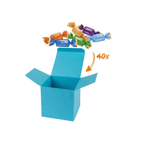 1 ColorBox Hellblau, gefüllt mit 40 Merci-Chocolate Collection je 6 g. Ein bunter Mix von Merci Schokoladen-Spezialitäten in den Geschmacksrichtungen Kaffee Sahne, Edel-Vollmilch, Praliné, Mandel, Dunkle Vollmilch, Weisse Crisp und Nougat (Sortierung kann von der Abbildung abweichen). • Quadratisch, flexibel und nachhaltig: die ColorBox ist ein Naturprodukt "MADE IN GERMANY" welches aus 100% Recyclingpapier hergestellt wird und in 12 leuchtenden Farben erhältlich ist. Die ColorBox kann auf Wunsch mit einem 4c Aufkleber oder 1c Druck individualisiert werden, weitere mögliche Werbeanbringungen sind eine Banderole 4c um die Box herum und ab 3000 Stück ein All-Over Druck 4c.