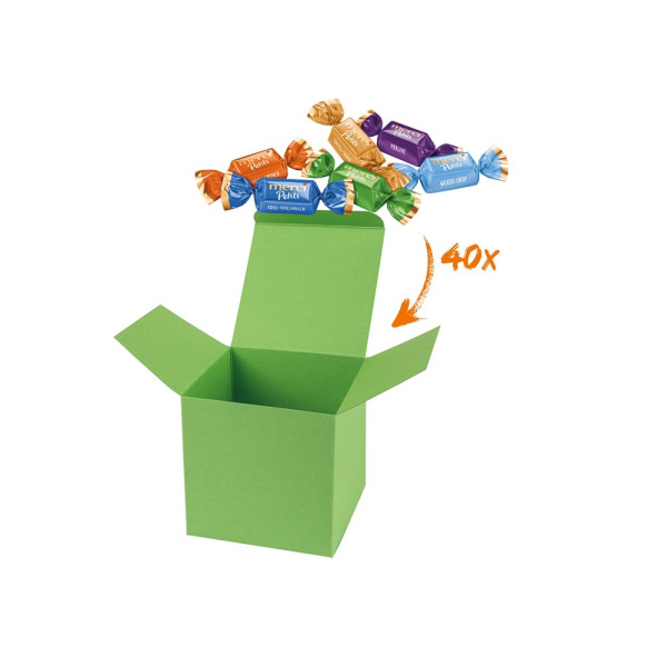 1 ColorBox Hellgrün, gefüllt mit 40 Merci-Chocolate Collection je 6 g. Ein bunter Mix von Merci Schokoladen-Spezialitäten in den Geschmacksrichtungen Kaffee Sahne, Edel-Vollmilch, Praliné, Mandel, Dunkle Vollmilch, Weisse Crisp und Nougat (Sortierung kann von der Abbildung abweichen). • Quadratisch, flexibel und nachhaltig: die ColorBox ist ein Naturprodukt "MADE IN GERMANY" welches aus 100% Recyclingpapier hergestellt wird und in 12 leuchtenden Farben erhältlich ist. Die ColorBox kann auf Wunsch mit einem 4c Aufkleber oder 1c Druck individualisiert werden, weitere mögliche Werbeanbringungen sind eine Banderole 4c um die Box herum und ab 3000 Stück ein All-Over Druck 4c.