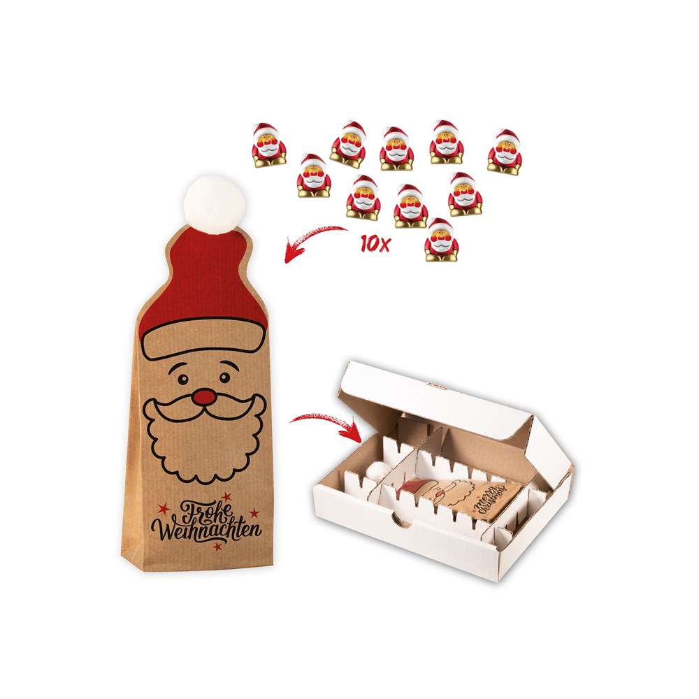 1 original Christmas Bag mit Standard-Druck "Frohe Weihnachten", gefüllt mit 10 Mini Schokoladen-Weihnachtsmännern je 5 g, inkl. Konfektion der Tüte in eine neutrale, weiße Versandbox. • Die ultimative Weihnachtstüte aus Papier - ein schelmischer Blick, rote Mütze, ein Bommel aus reiner Baumwolle mit Standard-Druck „Frohe Weihnachten“, so sieht ein ökologisch wertvoller Hingucker aus! Die Christmas Bag kann optional mit einem 4c Druck, 1c Druck oder einem 4c Aufkleber individualisiert werden, dabei kann sowohl auf der Vorderseite als auch auf der Rückseite die Werbeanbringung platziert werden - auf Wunsch auch auf beiden Seiten. Die spezielle Einzel-Versandbox für die Papiertüte ist eine kostengünstige und individuelle Lösung für den Porto-optimierten Versand. Der nachhaltige Versandkarton aus 70% recyceltem Material und 30% Material aus kontrollierter Waldwirtschaft ist „Briefkasten tauglich“ und kann somit kostengünstig als Maxibrief versendet werden. Der Versandkarton hat eine Höhe von 4,8 cm und der flexibel steckbare Gittereinsatz dient zur Fixierung der Bag, so wird sichergestellt, dass die schicke Tüte auch unbeschadet beim Empfänger ankommt. Alle Außenseiten der Mailing-Box sind individuell 4c bedruckbar, zusätzlich kann auch der Deckel auf der Innenseite mit einem 4c Druck gestaltet werden. Auf Wunsch übernehmen wir den kompletten Versandservice – Preis auf Anfrage.