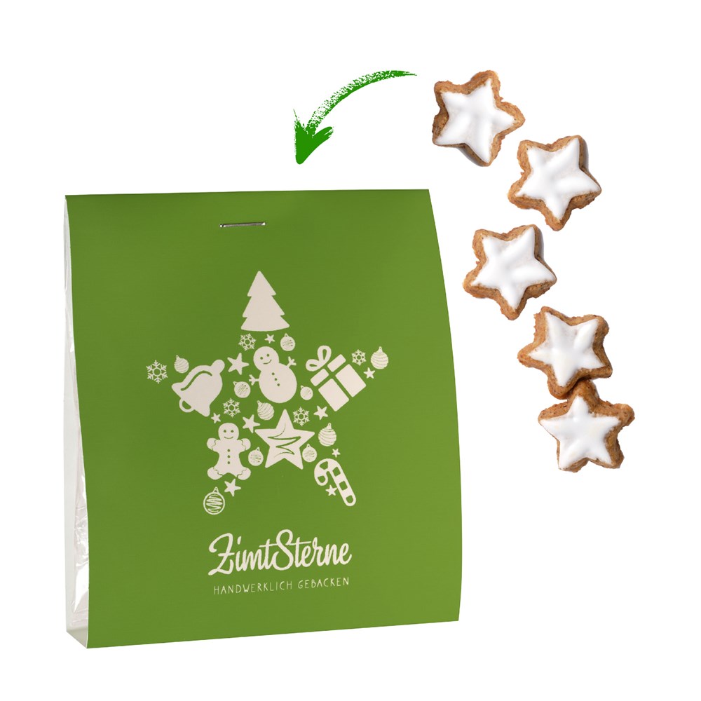 1 Smart Bag mit einem Beutel Zimtsterne 30 g. Köstliche Zimtsterne, handwerklich gebacken, in einem Folientütchen mit Smart-Bag Standard-Banderole „Zimtsterne“. • Mögliche Individualisierung: Smart Bag Banderole mit 4c-Digitaldruck. Die Smart Bag Banderole deckt die komplette Front, den Rücken und Boden des Beutels ab und bietet daher viel Fläche für ein individuelles und kreatives Design (Breite 11 cm und eine Länge von insgesamt 28 cm).