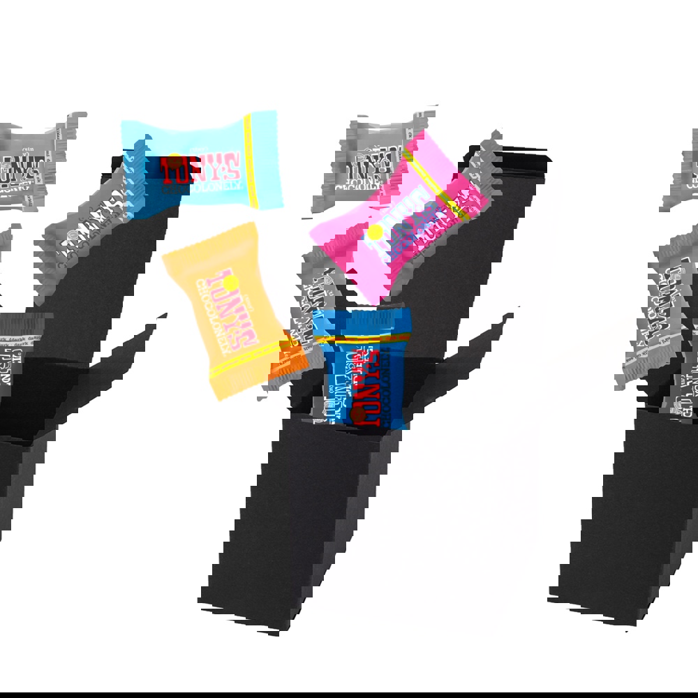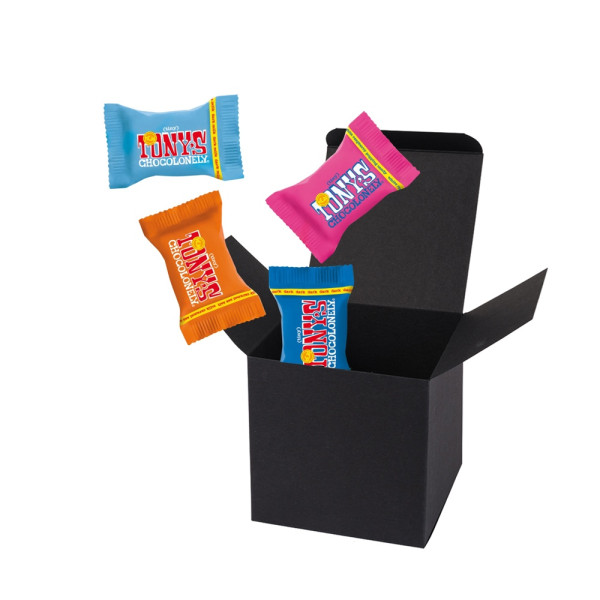 4 Tiny Tony´s verpackt in ColorBox Schwarz. • Quadratisch, flexibel und nachhaltig: die ColorBox ist ein Naturprodukt "MADE IN GERMANY" welches aus 100% Recyclingpapier hergestellt wird,gefüllt mit 4 Tiny Tony's, das sind Mini‑Schokoladentäfelchen in unterschiedlichen Sorten: Milch, Milch Karamell Meersalz, Milch Nougat, Milch Haselnuss, Zartbitter Mandel Meersalz, Dunkle Milch, Dunkle Milch Brezel, Dunkle Milch Brezel, Weiße Schokolade und Weiße Schokolade Himbeere Knusper (Sortierung kann von der Abbildung abweichen). Die ColorBox kann auf Wunsch mit einem 4c Aufkleber oder 1c Druck individualisiert werden, weitere mögliche Werbeanbringungen sind eine Banderole 4c um die Box herum und ab 3000 Stück ein All-Over Druck 4c.