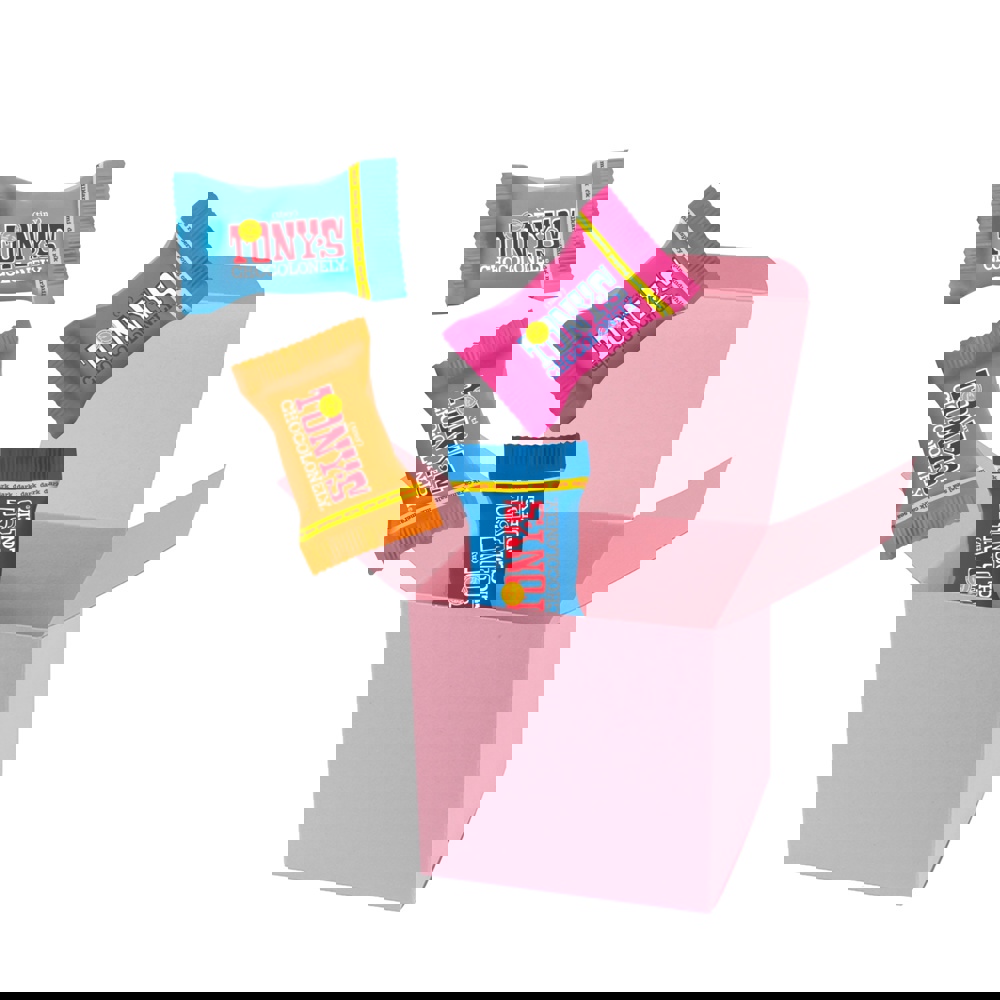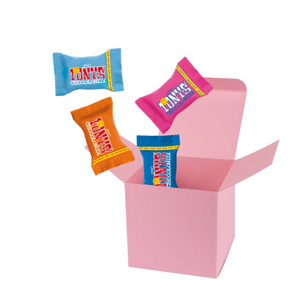 4 Tiny Tony´s verpackt in ColorBox Rosa. • Quadratisch, flexibel und nachhaltig: die ColorBox ist ein Naturprodukt "MADE IN GERMANY" welches aus 100% Recyclingpapier hergestellt wird,gefüllt mit 4 Tiny Tony's, das sind Mini‑Schokoladentäfelchen in unterschiedlichen Sorten: Milch, Milch Karamell Meersalz, Milch Nougat, Milch Haselnuss, Zartbitter Mandel Meersalz, Dunkle Milch, Dunkle Milch Brezel, Dunkle Milch Brezel, Weiße Schokolade und Weiße Schokolade Himbeere Knusper (Sortierung kann von der Abbildung abweichen). Die ColorBox kann auf Wunsch mit einem 4c Aufkleber oder 1c Druck individualisiert werden, weitere mögliche Werbeanbringungen sind eine Banderole 4c um die Box herum und ab 3000 Stück ein All-Over Druck 4c.