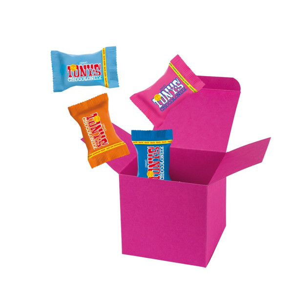 4 Tiny Tony´s verpackt in ColorBox Pink. • Quadratisch, flexibel und nachhaltig: die ColorBox ist ein Naturprodukt "MADE IN GERMANY" welches aus 100% Recyclingpapier hergestellt wird,gefüllt mit 4 Tiny Tony's, das sind Mini‑Schokoladentäfelchen in unterschiedlichen Sorten: Milch, Milch Karamell Meersalz, Milch Nougat, Milch Haselnuss, Zartbitter Mandel Meersalz, Dunkle Milch, Dunkle Milch Brezel, Dunkle Milch Brezel, Weiße Schokolade und Weiße Schokolade Himbeere Knusper (Sortierung kann von der Abbildung abweichen). Die ColorBox kann auf Wunsch mit einem 4c Aufkleber oder 1c Druck individualisiert werden, weitere mögliche Werbeanbringungen sind eine Banderole 4c um die Box herum und ab 3000 Stück ein All-Over Druck 4c.