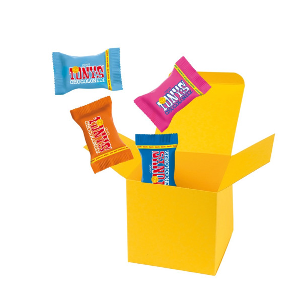 4 Tiny Tony´s verpackt in ColorBox Gelb. • Quadratisch, flexibel und nachhaltig: die ColorBox ist ein Naturprodukt "MADE IN GERMANY" welches aus 100% Recyclingpapier hergestellt wird,gefüllt mit 4 Tiny Tony's, das sind Mini‑Schokoladentäfelchen in unterschiedlichen Sorten: Milch, Milch Karamell Meersalz, Milch Nougat, Milch Haselnuss, Zartbitter Mandel Meersalz, Dunkle Milch, Dunkle Milch Brezel, Dunkle Milch Brezel, Weiße Schokolade und Weiße Schokolade Himbeere Knusper (Sortierung kann von der Abbildung abweichen). Die ColorBox kann auf Wunsch mit einem 4c Aufkleber oder 1c Druck individualisiert werden, weitere mögliche Werbeanbringungen sind eine Banderole 4c um die Box herum und ab 3000 Stück ein All-Over Druck 4c.