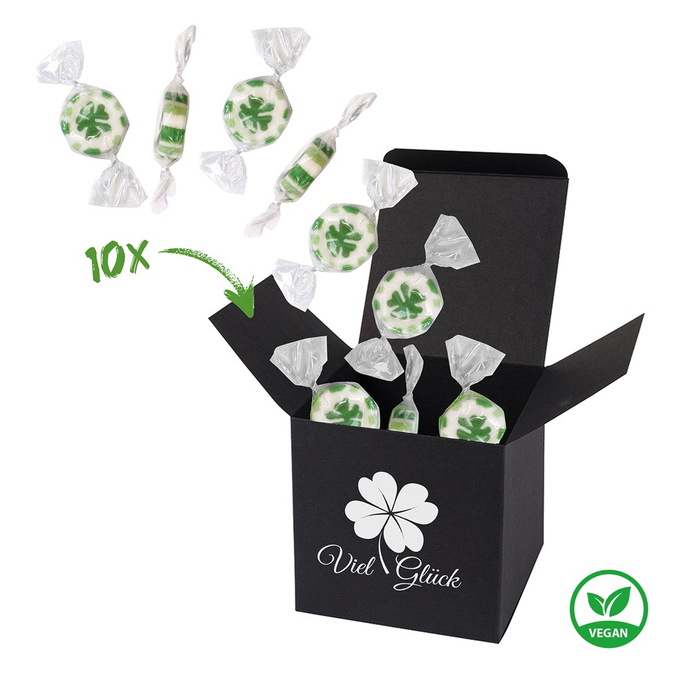 1 ColorBox Schwarz gefüllt mit 10 einzeln gewickelten, handgemachten Rock-Hartkaramell-Bonbons "Kleeblatt" je 5 g (vegan, vegetarisch & glutenfrei). • Quadratisch, flexibel und nachhaltig: die ColorBox ist ein Naturprodukt "MADE IN GERMANY" welches aus 100% Recyclingpapier hergestellt wird und in 13 leuchtenden Farben erhältlich ist. Zusätzlich gibt es die Box auch aus naturbelassenem GRASKARTON - das ist Nachhaltigkeit pur! Die ColorBox kann auf Wunsch mit einem 4c Aufkleber oder 1c Druck individualisiert werden, weitere mögliche Werbeanbringen sind eine Banderole 4c um die Box herum und ab 3000 Stück ein All-Over Druck 4c.