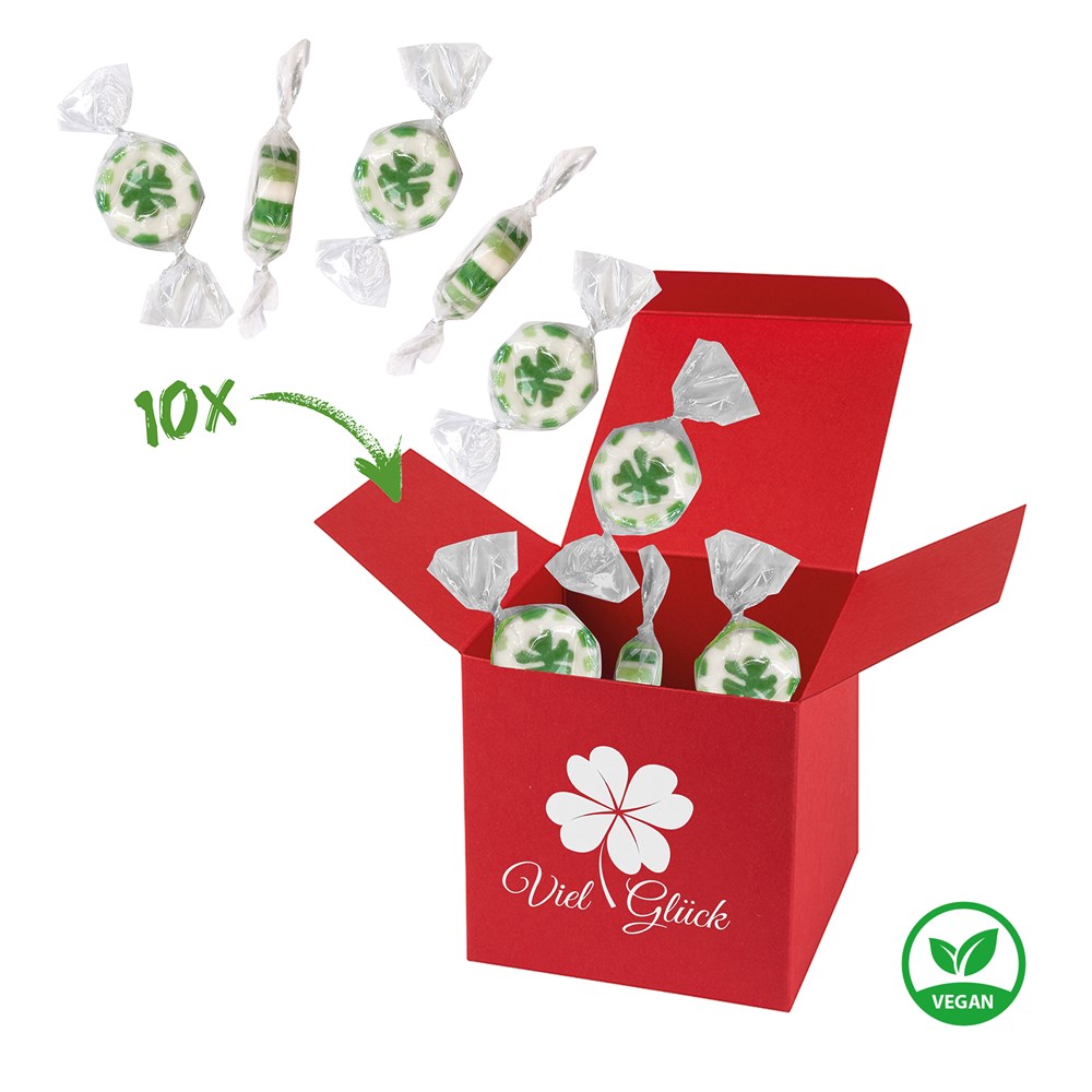 1 ColorBox Rot gefüllt mit 10 einzeln gewickelten, handgemachten Rock-Hartkaramell-Bonbons "Kleeblatt" je 5 g (vegan, vegetarisch & glutenfrei). • Quadratisch, flexibel und nachhaltig: die ColorBox ist ein Naturprodukt "MADE IN GERMANY" welches aus 100% Recyclingpapier hergestellt wird und in 13 leuchtenden Farben erhältlich ist. Zusätzlich gibt es die Box auch aus naturbelassenem GRASKARTON - das ist Nachhaltigkeit pur! Die ColorBox kann auf Wunsch mit einem 4c Aufkleber oder 1c Druck individualisiert werden, weitere mögliche Werbeanbringen sind eine Banderole 4c um die Box herum und ab 3000 Stück ein All-Over Druck 4c.