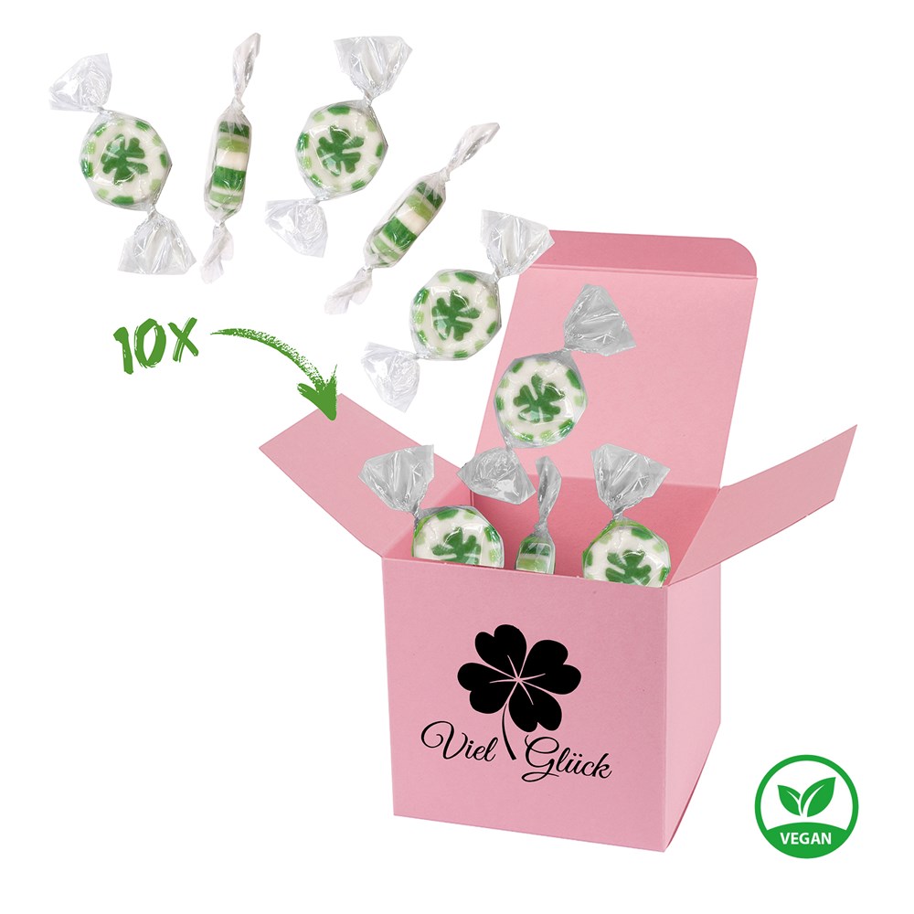 1 ColorBox Rosa gefüllt mit 10 einzeln gewickelten, handgemachten Rock-Hartkaramell-Bonbons "Kleeblatt" je 5 g (vegan, vegetarisch & glutenfrei). • Quadratisch, flexibel und nachhaltig: die ColorBox ist ein Naturprodukt "MADE IN GERMANY" welches aus 100% Recyclingpapier hergestellt wird und in 13 leuchtenden Farben erhältlich ist. Zusätzlich gibt es die Box auch aus naturbelassenem GRASKARTON - das ist Nachhaltigkeit pur! Die ColorBox kann auf Wunsch mit einem 4c Aufkleber oder 1c Druck individualisiert werden, weitere mögliche Werbeanbringen sind eine Banderole 4c um die Box herum und ab 3000 Stück ein All-Over Druck 4c.