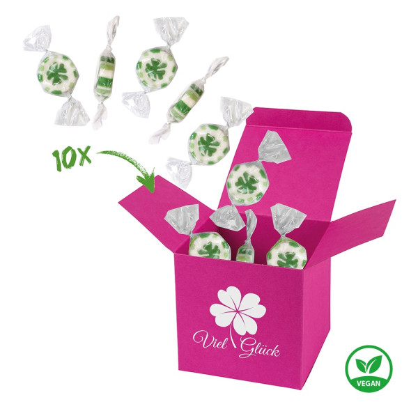 1 ColorBox Pink gefüllt mit 10 einzeln gewickelten, handgemachten Rock-Hartkaramell-Bonbons "Kleeblatt" je 5 g (vegan, vegetarisch & glutenfrei). • Quadratisch, flexibel und nachhaltig: die ColorBox ist ein Naturprodukt "MADE IN GERMANY" welches aus 100% Recyclingpapier hergestellt wird und in 13 leuchtenden Farben erhältlich ist. Zusätzlich gibt es die Box auch aus naturbelassenem GRASKARTON - das ist Nachhaltigkeit pur! Die ColorBox kann auf Wunsch mit einem 4c Aufkleber oder 1c Druck individualisiert werden, weitere mögliche Werbeanbringen sind eine Banderole 4c um die Box herum und ab 3000 Stück ein All-Over Druck 4c.
