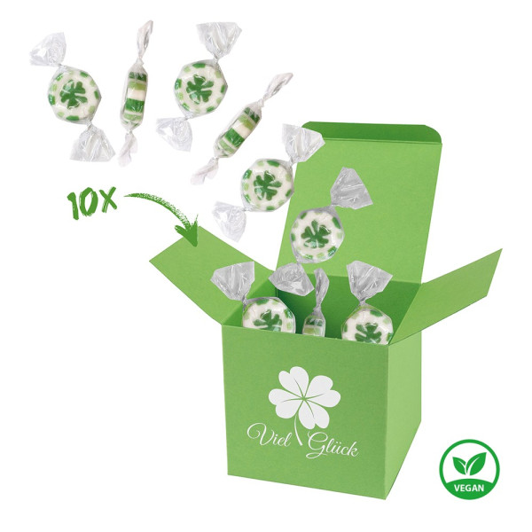 1 ColorBox Hellgrün gefüllt mit 10 einzeln gewickelten, handgemachten Rock-Hartkaramell-Bonbons "Kleeblatt" je 5 g (vegan, vegetarisch & glutenfrei). • Quadratisch, flexibel und nachhaltig: die ColorBox ist ein Naturprodukt "MADE IN GERMANY" welches aus 100% Recyclingpapier hergestellt wird und in 13 leuchtenden Farben erhältlich ist. Zusätzlich gibt es die Box auch aus naturbelassenem GRASKARTON - das ist Nachhaltigkeit pur! Die ColorBox kann auf Wunsch mit einem 4c Aufkleber oder 1c Druck individualisiert werden, weitere mögliche Werbeanbringen sind eine Banderole 4c um die Box herum und ab 3000 Stück ein All-Over Druck 4c.
