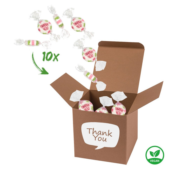 1 ColorBox Braun gefüllt mit 10 einzeln gewickelten, handgemachten Rock-Hartkaramell-Bonbons "Thank You" je 5 g (vegan, vegetarisch & glutenfrei). • Quadratisch, flexibel und nachhaltig: die ColorBox ist ein Naturprodukt "MADE IN GERMANY" welches aus 100% Recyclingpapier hergestellt wird und in 13 leuchtenden Farben erhältlich ist. Zusätzlich gibt es die Box auch aus naturbelassenem GRASKARTON - das ist Nachhaltigkeit pur! Die ColorBox kann auf Wunsch mit einem 4c Aufkleber oder 1c Druck individualisiert werden, weitere mögliche Werbeanbringen sind eine Banderole 4c um die Box herum und ab 3000 Stück ein All-Over Druck 4c.